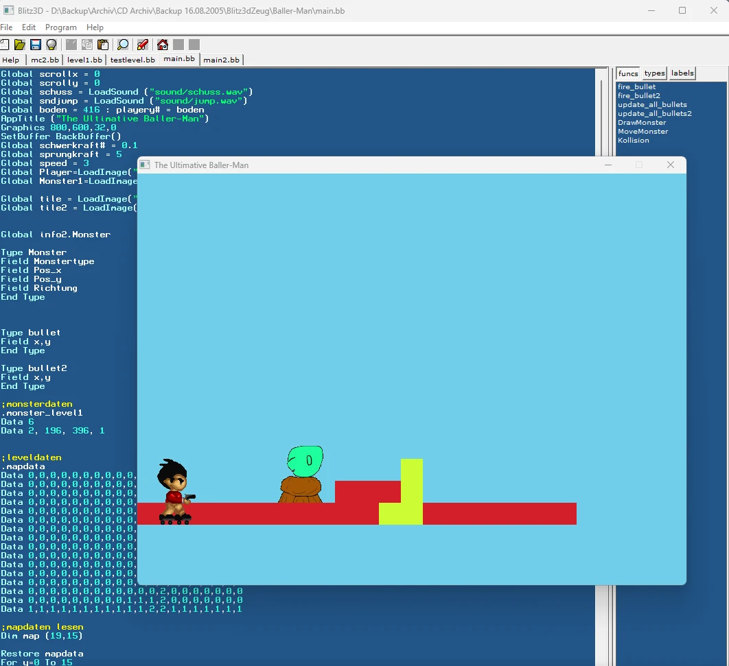 Heute bin ich zufällig auf eins meiner ganz alten Projekte gestoßen. Ballerman habe ich dieses Meisterwerk damals genannt. Das war das erste Mal, dass ich mich mit Kollisionserkennung befasst habe und nahezu daran verzweifelt bin.